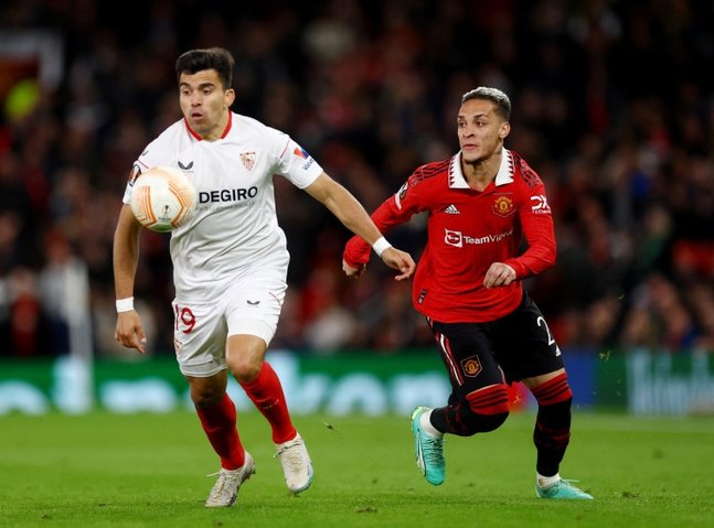 Marcel Sabitzer’s quickfire double within the first half put Erik ten Hag’s crew in charge of the tie, however Sevilla, report six-times Europa League champions, pulled one again within the 84th minute when Jesus Navas’s shot pinged off the ft of Tyrell Malacia and keeper David de Gea into the web.