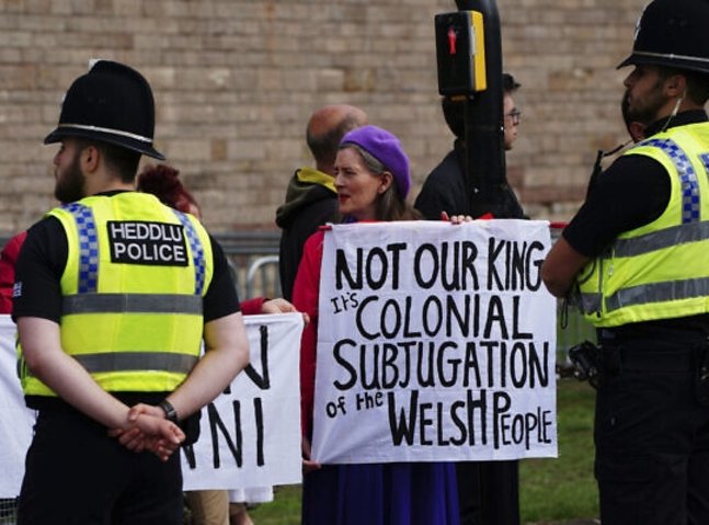 The group carried banners studying “Not My King,” and chanted anti-monarchy slogans in the course of the demonstration. “Down with the Crown,” “Racist Royal Family” had been amongst different indicators the protesters carried.